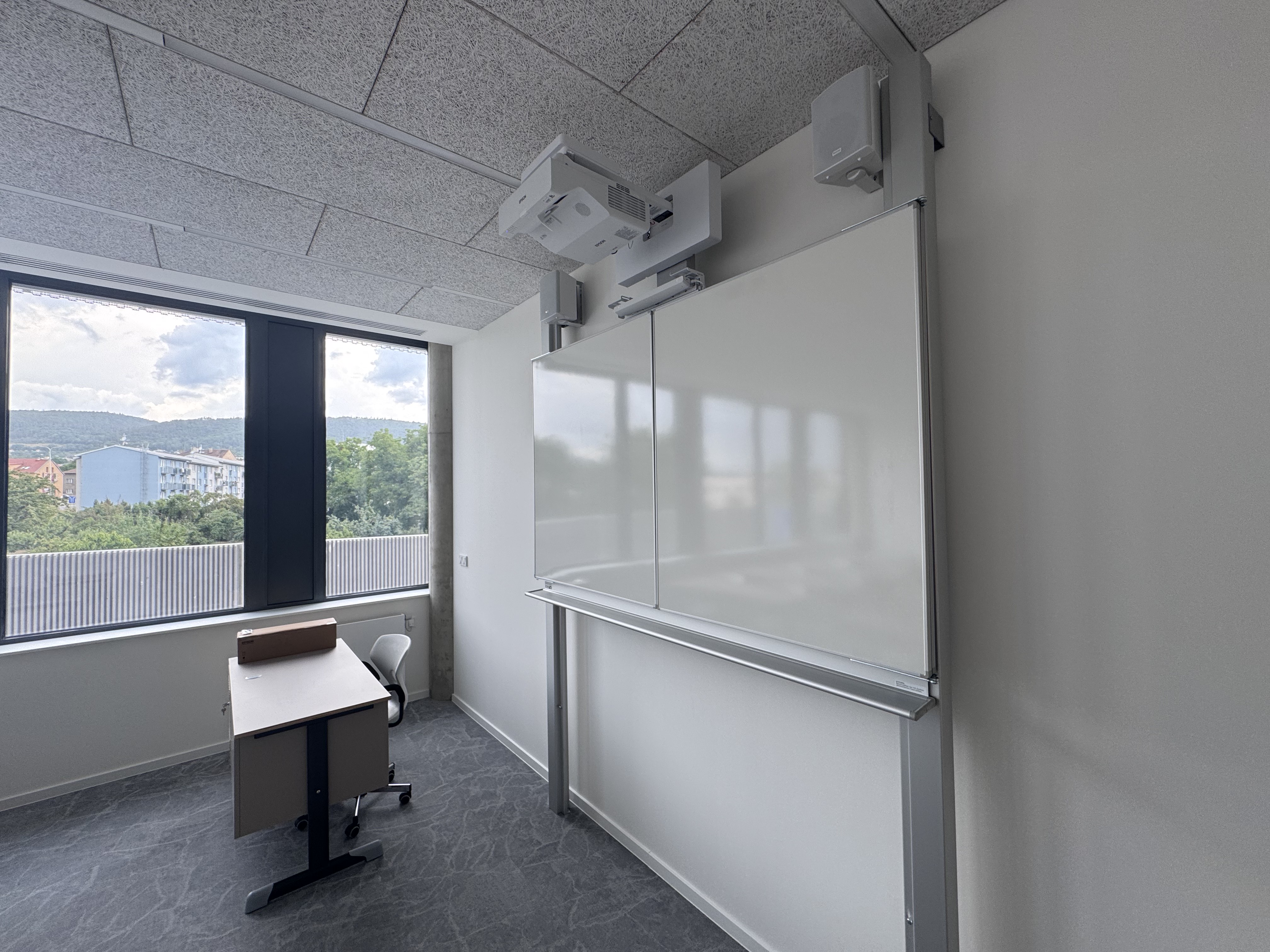 V každé učebně je projektor propojen s interaktivním modulem a dokovací stanicí. Učitel na katedře připojuje svůj notebook jen pomocí jednoho USB‑C kabelu z dokovací stanice. Tím se automaticky propojí s projektorem, dotykovým ovládáním a reproduktory.